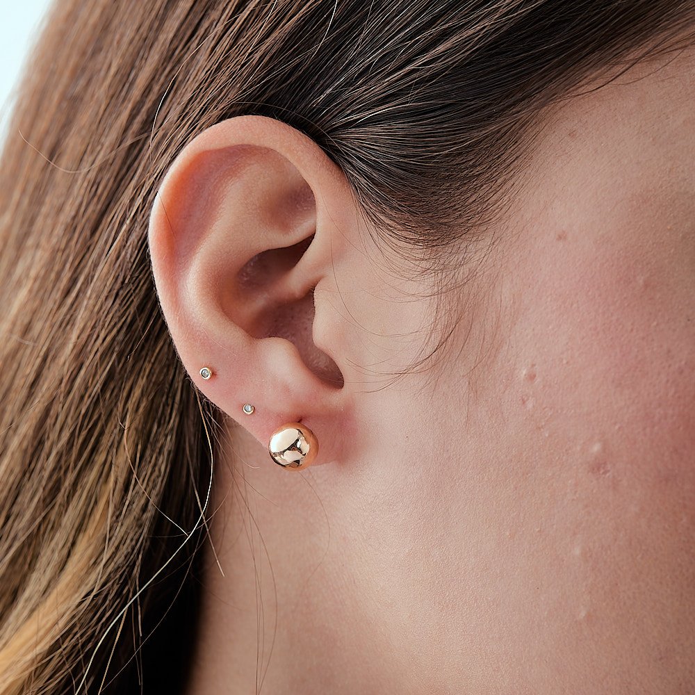 Estos topos en oro de 18k ofrecen un toque de sofisticación, con su diseño minimalista que ilumina tu rostro con elegancia discreta.